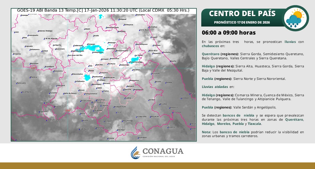 El SMN pronosticó para hoy sábado 17 de enero que el frente frío núm. 29 se desplazará sobre el noreste y oriente del territorio nacional enero 17, 2026 El Sistema Meteorológico Nacional (SMN) pronosticó para hoy sábado 17 de enero que el frente frío núm. 29 se desplazará sobre el noreste y oriente del territorio nacional, en interacción con una vaguada en altura y las corrientes en chorro polar y subtropical, originarán lluvias y chubascos en dichas regiones, así como lluvias de fuertes a muy fuertes en Querétaro, Hidalgo, Puebla y Veracruz. La masa de aire polar asociada al frente, ocasionará un nuevo descenso de las temperaturas sobre el norte, noreste y oriente del país; así como un nuevo evento de “Norte” con rachas de 60 a 80 km/h y oleaje elevado en las costas de Tamaulipas y Veracruz; extendiéndose durante la madrugada del domingo al istmo y golfo de Tehuantepec. Leer también: Muertes de migrantes en frontera de Arizona y México caen a niveles “históricos”, dice ONG Por otra parte, el persistente ingreso de humedad del océano Pacífico hacia el occidente del país, aunado a inestabilidad atmosférica ocasionarán lluvias y chubascos con descargas eléctricas en estados del norte, occidente, centro y sur del territorio mexicano, además de lluvias puntuales fuertes en el Estado de México. Pronóstico de lluvias para mañana hoy 17 de enero: Lluvias fuertes con puntuales muy fuertes (50 a 75 mm): Puebla (Sierra Norte y Sierra Nororiental) y Veracruz (Totonaca y Nautla). Chubascos con lluvias puntuales fuertes (25 a 50 mm): Querétaro, Hidalgo, Estado de México y Veracruz (Huasteca Baja y Capital). Intervalos de chubascos (5 a 25 mm): Durango, Zacatecas, Aguascalientes, San Luis Potosí, Tamaulipas, Jalisco, Colima, Michoacán, Guanajuato, Tlaxcala, Ciudad de México, Morelos, Guerrero, Puebla (Valle Serdán, Angelópolis y Tehuacán-Sierra Negra), Oaxaca, Chiapas, Veracruz (Huasteca Alta, Sotavento, Las Montañas, Papaloapan, Los Tuxtlas y Olmeca), Tabasco, Campeche, Yucatán y Quintana Roo. Lluvias aisladas (0.1 a 5 mm): Coahuila, Nuevo León y Nayarit. Pronóstico de temperaturas mínimas: Temperaturas mínimas de -10 a -5 °C con heladas: zonas serranas de Baja California, Chihuahua y Durango. Temperaturas mínimas de -5 a 0 °C con heladas: zonas serranas de Sonora, Coahuila, Nuevo León, San Luis Potosí, Zacatecas, Michoacán, Guanajuato, Querétaro, Hidalgo, Estado de México, Tlaxcala, Puebla, Veracruz y Oaxaca. Temperaturas mínimas de 0 a 5 °C: zonas serranas de Jalisco, Tamaulipas, Aguascalientes, Ciudad de México, Morelos y Chiapas.